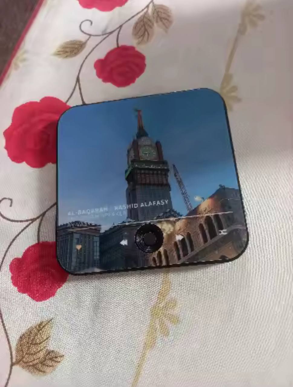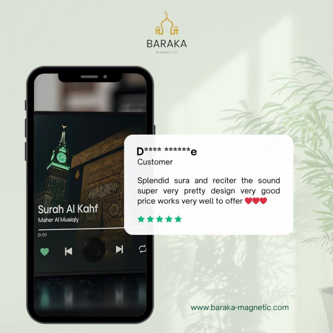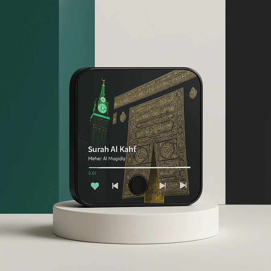 Thanks to its powerful magnet, it attaches securely to any metal surface. Its clear speaker plays the suras with purity, creating an atmosphere of serenity and daily reminders.