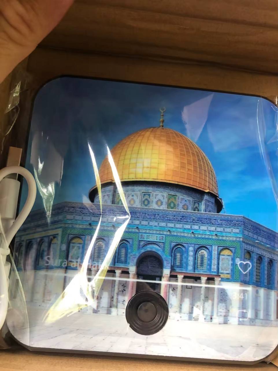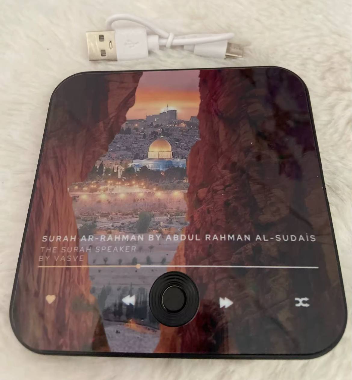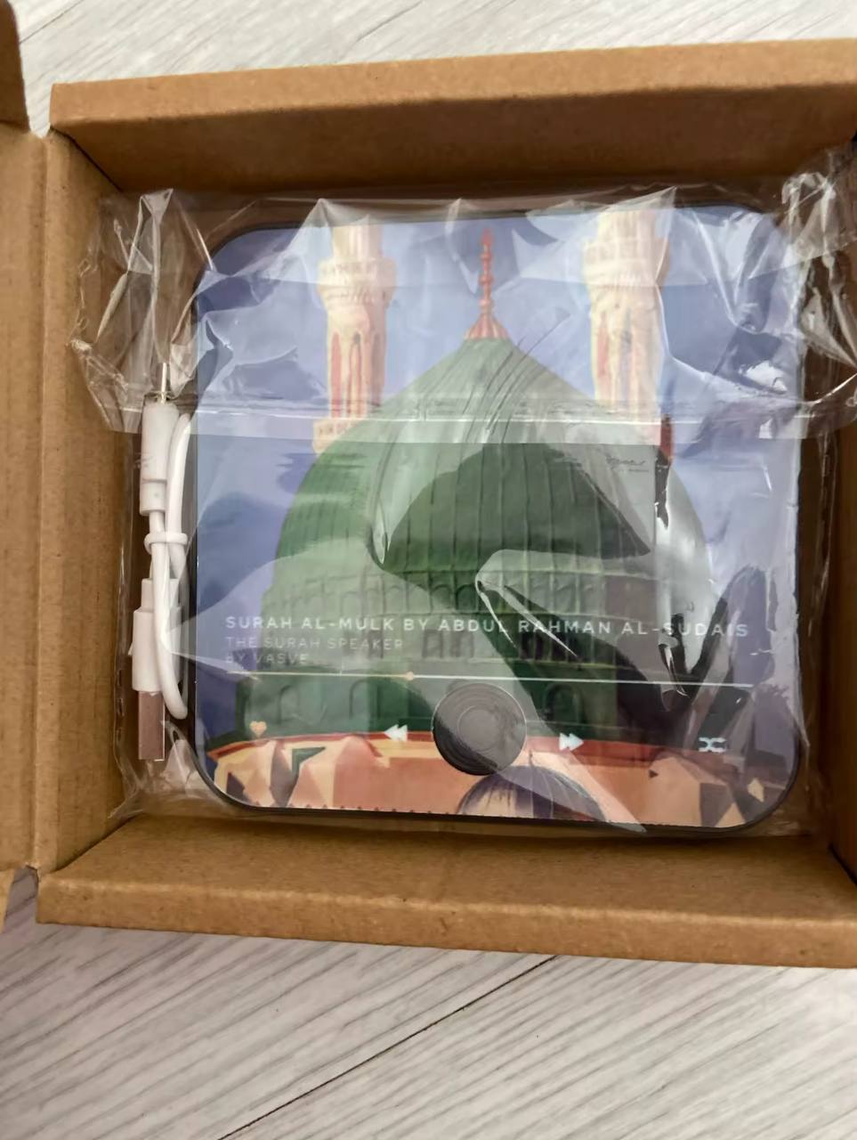 Thanks to its powerful magnet, it attaches securely to any metal surface. Its clear speaker plays the suras with purity, creating an atmosphere of serenity and daily reminders.